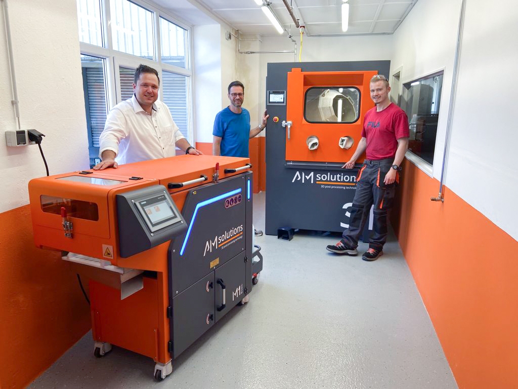 Um Kunden einbaufertige 3D-gedruckte Kunststoff- und Metallkomponenten bieten zu können, setzte das Dienstleistungsunternehmen Klaus Stöcker Metallbearbeitung bei der Nachbearbeitung zunächst auf manuelle Prozesse. Aufgrund einer stetig steigenden Nachfrage sowie immer höheren Anforderungen an die Prozesssicherheit und Reproduzierbarkeit des Post Processing investierte das Unternehmen in die automatisierten Lösungen S1 für das Entpulvern sowie die M1 Basic von AM Solutions – 3D post processing technology, die das effektive und wirtschaftliche Glätten und Homogenisieren der Oberflächen ermöglicht. Eine zweite solche Anlage, die eine kostengünstige Alternative zum chemischen Glätten darstellt, nahm das Dienstleistungsunternehmen aufgrund seiner positiven Erfahrungen kürzlich in Betrieb.