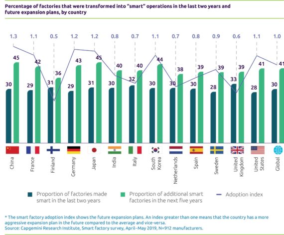 Forschungsmethodik: Für die Studie wurden über 1.000 Produktionsunternehmen befragt. Hierbei konzentrierte man sich in erster Linie auf Unternehmen, die eine Smart Factory-Initiative aus 13 Ländern (China, Frankreich, Finnland, Deutschland, Japan, Indien, Italien, Südkorea, Niederlande, Spanien, Schweden, Großbritannien, USA) in den Branchen – diskrete Fertigung, Prozessindustrie, Energie, Energie und Versorgungsunternehmen, Konsumgüter – gestartet hatten. Das Capgemini Research Institute führte auch fast zwanzig ausführliche Gespräche mit Führungskräften, die eine Smart-Factory-Initiative oder eine Intelligente Fabrik leiten.