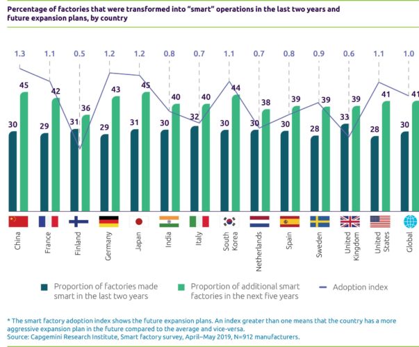 Im Vergleich zu einer Studie von vor zwei Jahren schreiten heute mehr Unternehmen mit ihren Smart-Factory-Initiativen voran. Seit 2017 wurde ein Drittel der Fabriken bereits in intelligente Anlagen umgewandelt. Produktionsunternehmen weltweit wollen in den nächsten fünf Jahren 40 Prozent mehr intelligente Fabriken aufbauen. Dazu planen sie in den kommenden drei Jahren pro Jahr durchschnittlich 3,24 Prozent ihres Umsatzes ein. Im Vergleich dazu sollen in Deutschland in den nächsten fünf Jahren 43 Prozent mehr Fabriken dieser Art entstehen, wobei hier durchschnittlich 3,51 Prozent des Umsatzes pro Jahr angedacht ist.